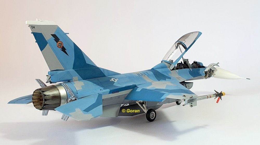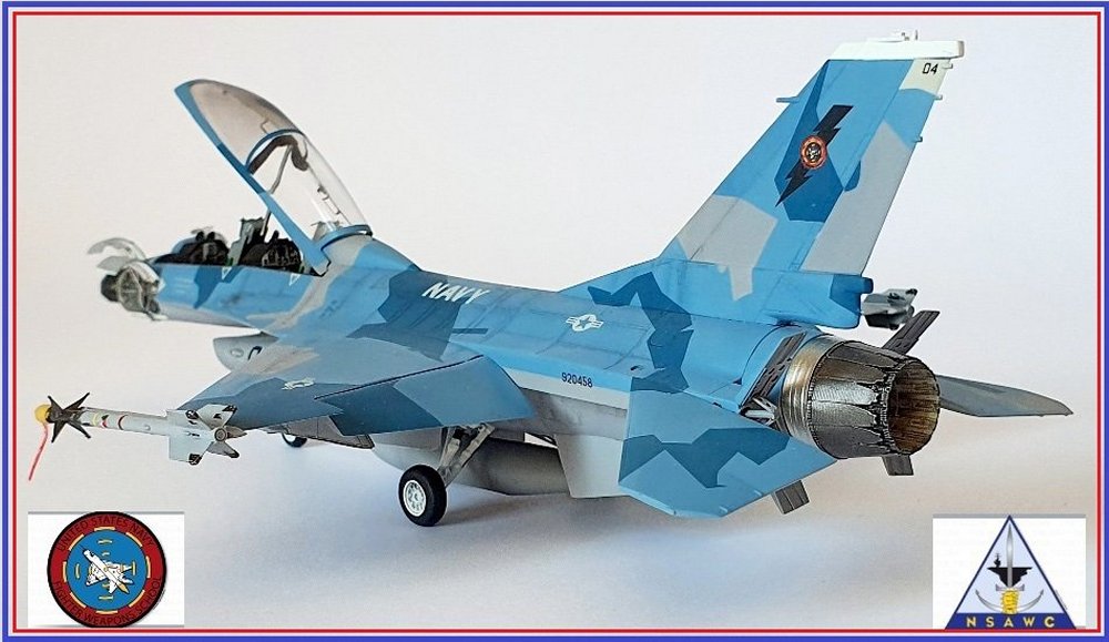 Having a lot of gray/gray models on my shelf, I was searching for something different and I believe this really looks good and attractive. This Navy F-16B is one of originally built for Pakistan. After withdrawal of the F-16N, the Navy managed to find this as solution for high performance aggressor aircraft. Fourteen airframes, ordered by Pakistan in the early nineties, but never delivered, due to a weapon embargo, were taken out of storage and delivered to the Navy. Those aircraft were stored at AMARC straight from the production line. They have a very low airframe life, making them ideal for the demanding aggressor task. It's about the last block 15s ever built. This particular plane is BuNo920458 and is in active service, as the part of USNAVY NSAWC, since December 2002.
